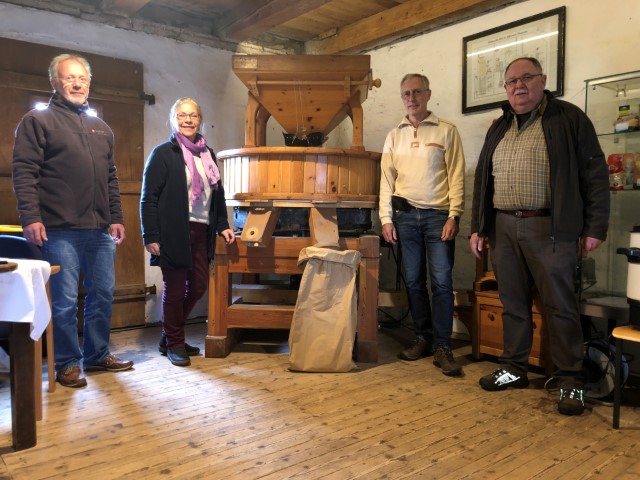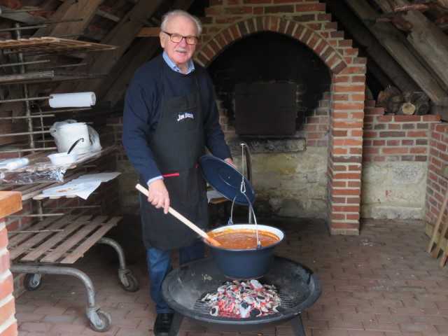 Der Vorstand hatte die Vereinsmitglieder zum Einmahlen eingeladen und alle waren mit dem Weizenschrot als Mahlergebnis sehr zufrieden. Passend zur Jahreszeit und zum Wetter gab es Glühwein und von Herbert Wrobel angerichtete Gulaschsuppe aus dem großen Topf. Herbert hatte flugs eigens dazu noch einen passenden Kochlöffel angefertigt.